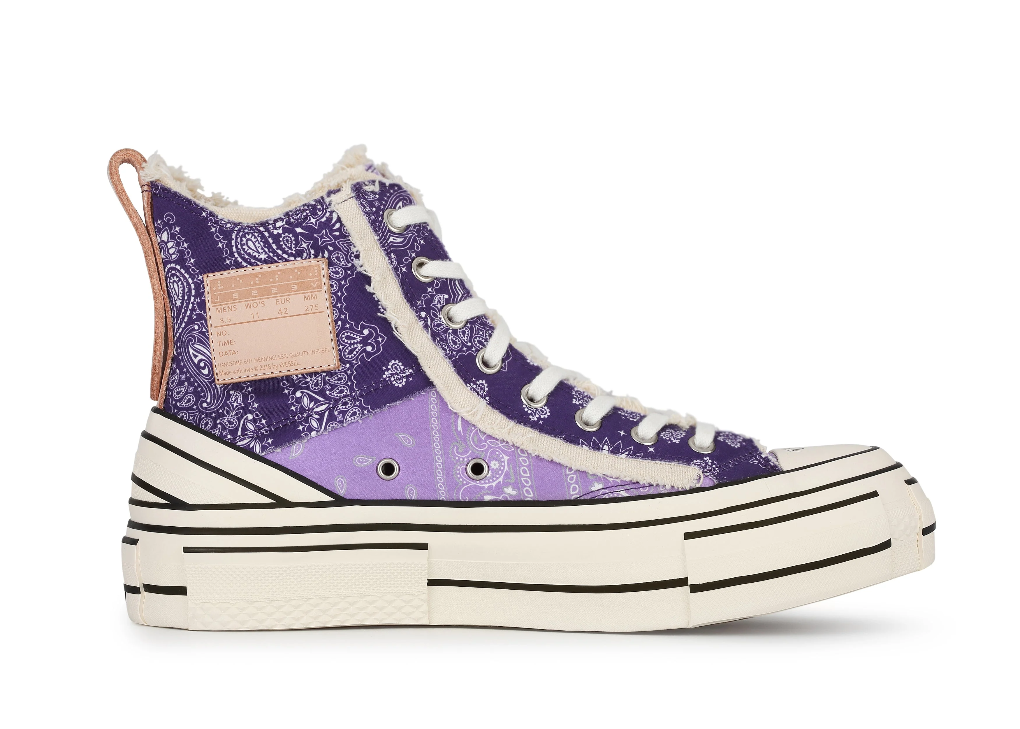 Embrace the essence of deconstructed design with the G.O.P.Highs Violet Paisleys, featuring irregular fringed edges and vibrant violet paisley patterns for a distinct high-top aesthetic. With innovative vulcanized coverage, these sneakers offer bold style and exceptional comfort, embodying the epitome of classic high-top design with a modern twist.